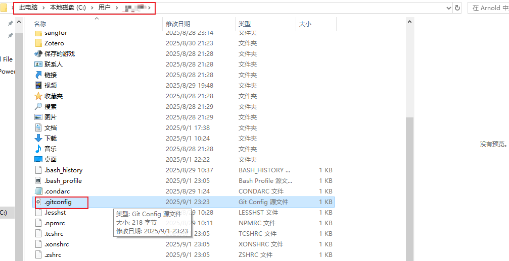 1.打开路径 C:\Users\用户名,找到git的配置文件