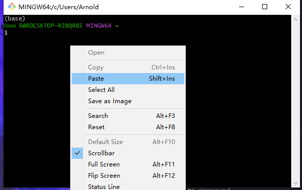 - 打开Git Bash并且点击paste。切记不用 Crtl + V , 如果已经操作了,请重新打开。
