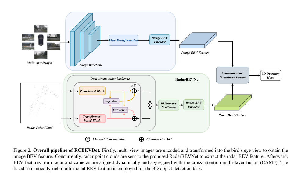 RadarBEVNet 的作用就是高效提取雷达的特征,有两个组件,分别是是 the dual-stream radar backbone 和 the RCS-aware BEV encoder。前者主要用于雷达特征的初步提取,后者对提取的特征进行再处理。