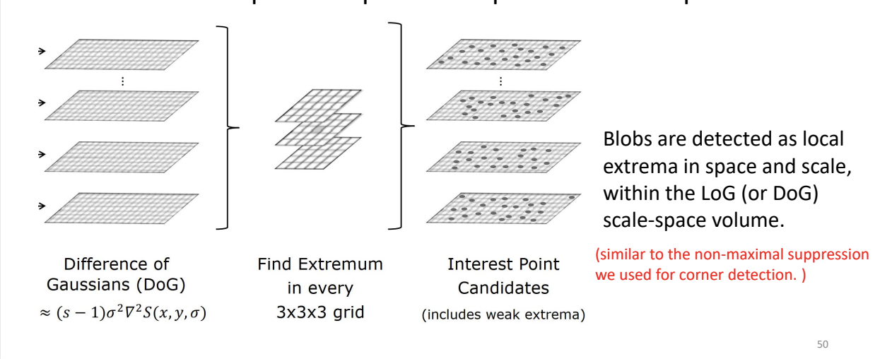 - 特征检测:我们在 DoG 图上寻找极值(斑点)。