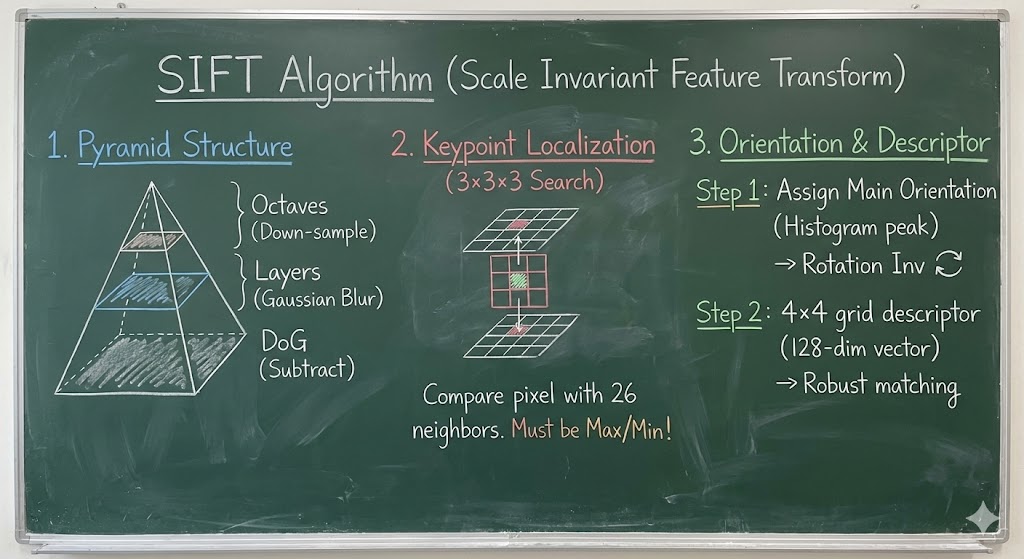 这张幻灯片是 SIFT 算法实现的终极蓝图。它把之前讲的所有零碎知识点(高斯模糊、DoG、降采样、尺度空间)全部串联起来,展示了 SIFT 具体的金字塔架构。