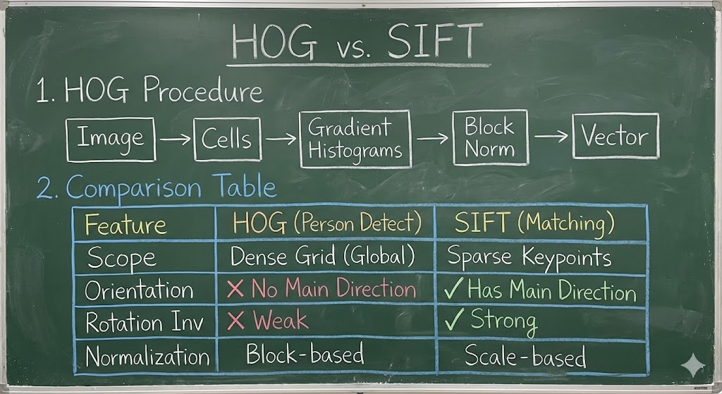 - HoG 用于描述整个图像,SIFT用于关键点匹配