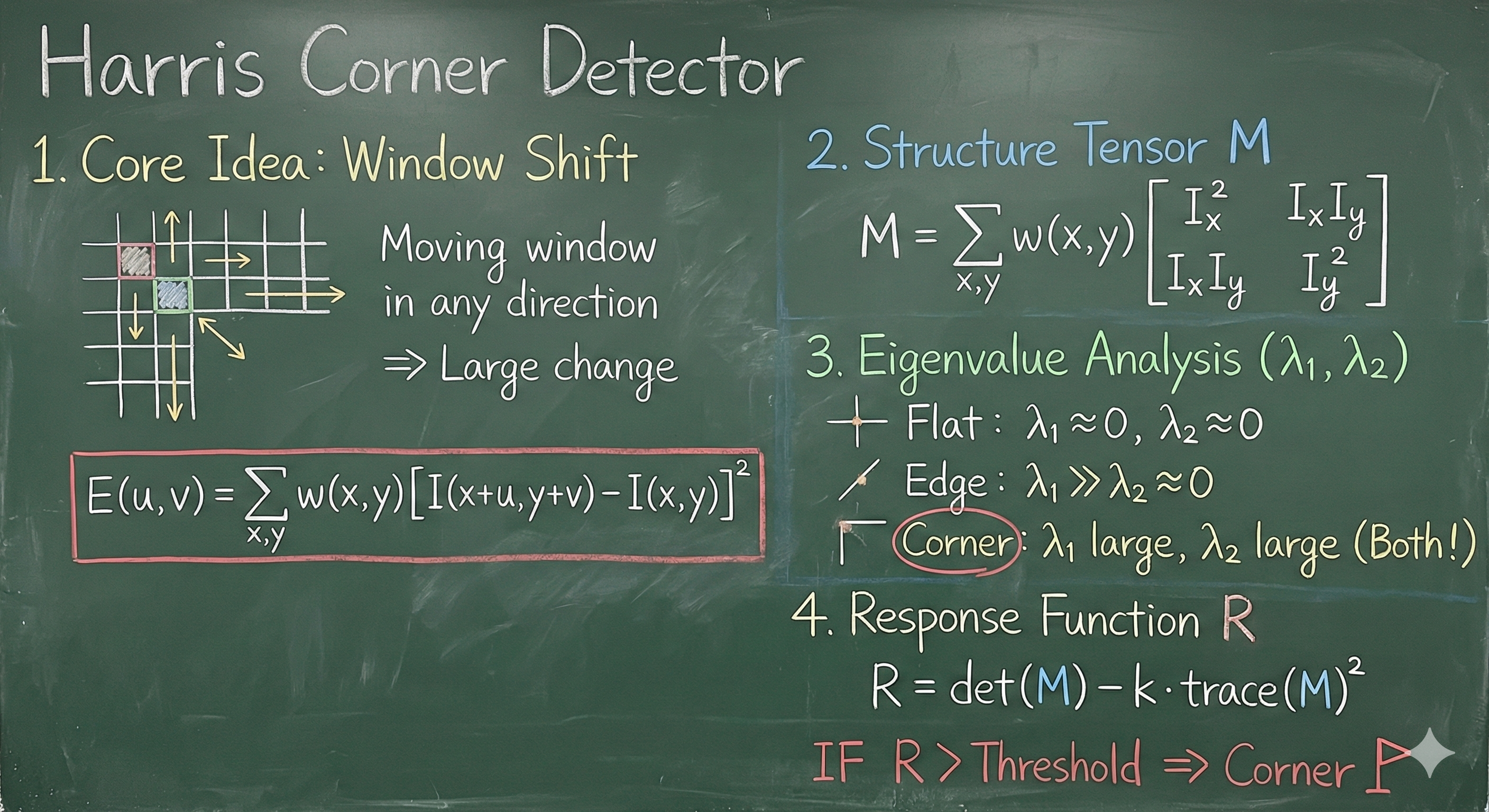 Harris 提出了一种巧妙的方法,通过定义一个评分函数 $ R $,不需要计算特征值本身,就能直接判断角点。