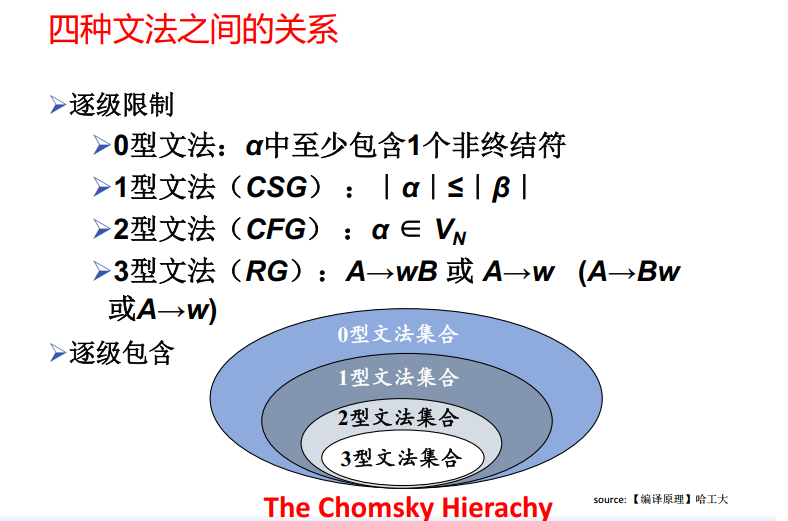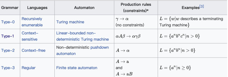 - 0型文法, 又称无限制文法,$\alpha \to \beta$,唯一的限制是规则左侧至少包含一个非终结符