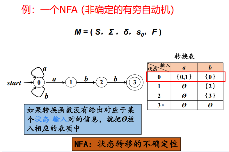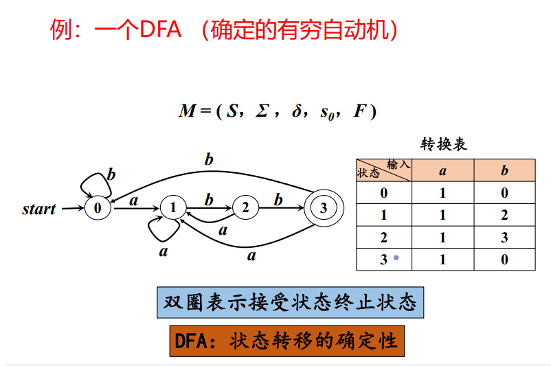 - DFA 的确定性体现在: 对于任意的状态 $s \in Q$ 和任意的输入符号 $a \in \Sigma$,$\delta(s, a)$ 唯一地确定了下一个状态。