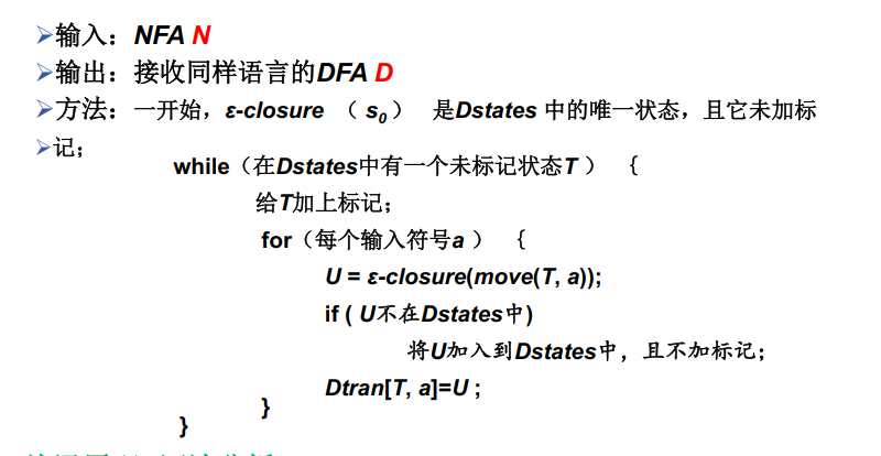 DFA中的每个状态都是一个由NFA中的状态构成的集合,即NFA转态集合的一个子集,我们可以通过子集构造法: