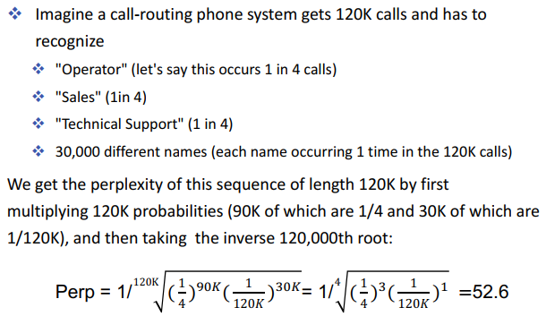 - $PP(W) = \sqrt[N]{\prod_{i=1}^{N} \frac{1}{P(w_i | w_{i-1})}}$