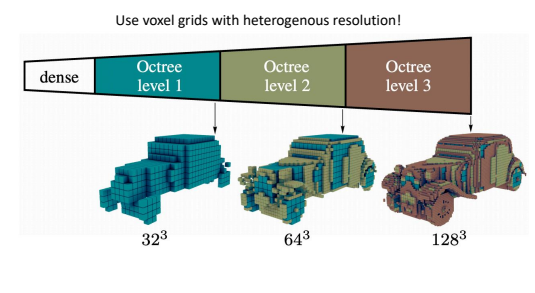 - 结果: 我们只在物体表面(需要细节的地方)使用高分辨率的小方块,而在空旷的背景或物体内部使用低分辨率的大方块。这极大地节省了内存