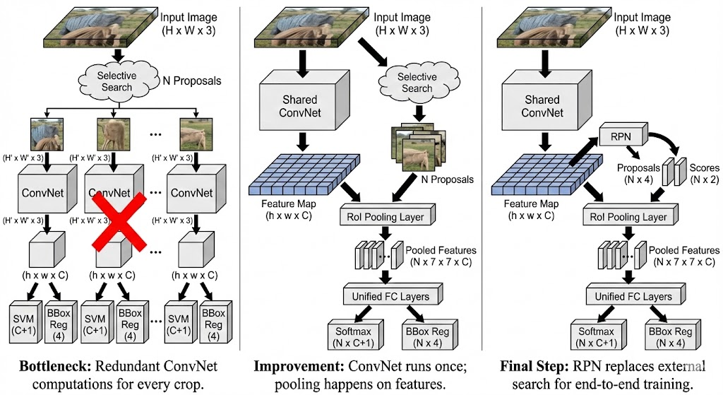 | 处理对象 (Core Transformation) | Image Proposals: 处理的是原始图像上的切片(Warped image regions)。 | Feature Proposals: 处理的是卷积特征图上的切片。 | 从“处理图像块”进化为“处理特征块”。 |