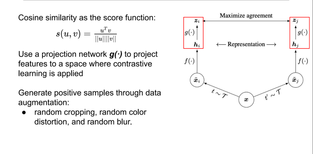 - 非线性投影头:在特征层之后加一个 MLP(投影头 $g(\cdot)$)再算 Loss,效果显著提升。
