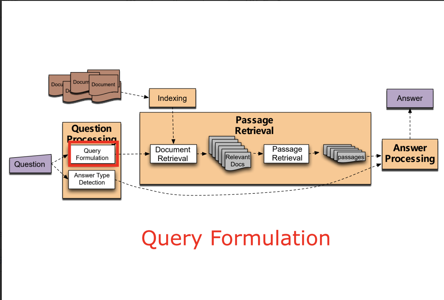 - 答案类型检测:判断答案的实体类型(如人名、地点、数字)。介绍了Li & Roth的分类体系(6个大类,50个小类)。方法包括正则表达式、人工规则和机器学习分类。